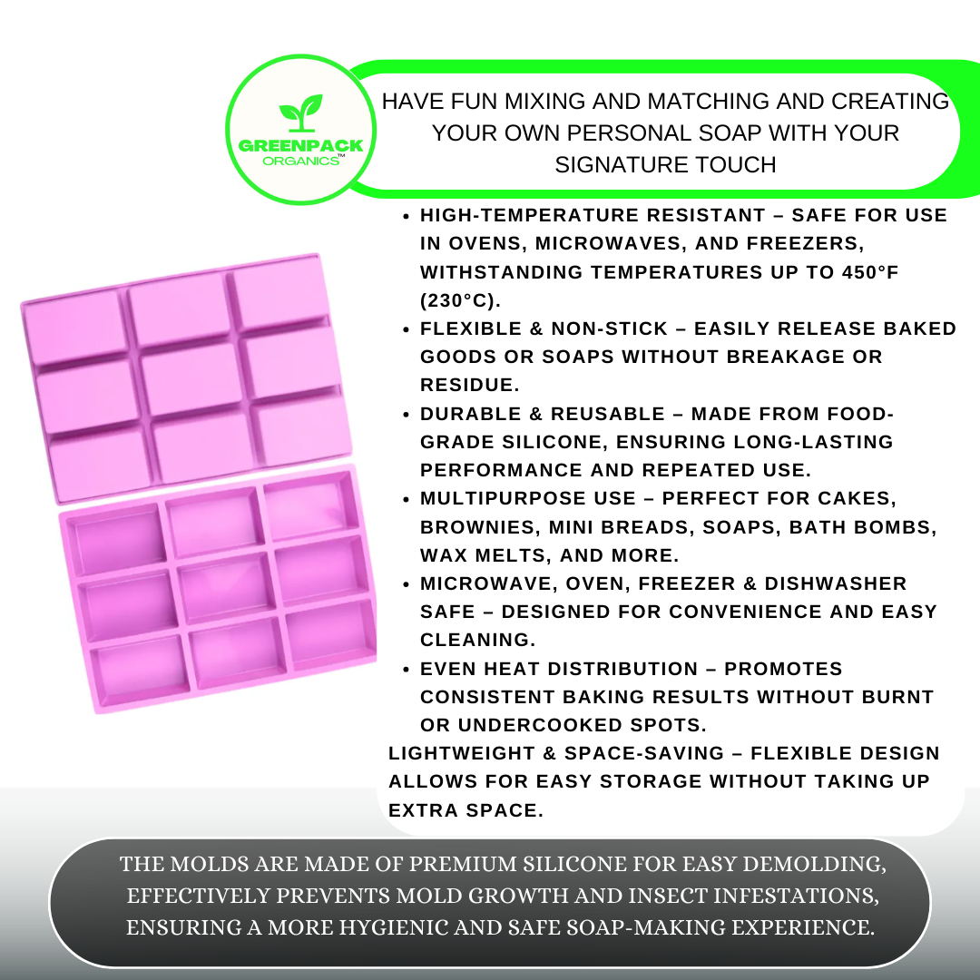 Upgrade your baking and crafting experience with the GreenPack Organics 9-Cavity Rectangle Silicone Mold. Durable, non-stick, and versatile—this mold is a must-have for any kitchen or workshop. Order yours today!