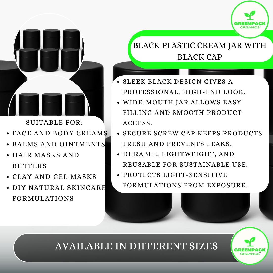 A premium-quality black plastic cream jar designed specifically for cosmetic uses. With its elegant black finish and secure screw cap, it’s perfect for housing creams, balms, masks, and other skincare products.