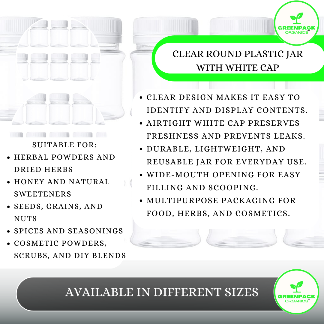 Clear design makes it easy to identify and display contents.Airtight white cap preserves freshness and prevents leaks.Durable, lightweight, and reusable jar for everyday use.Wide-mouth opening for easy filling and scooping.Multipurpose packaging for food, herbs, and cosmetics.