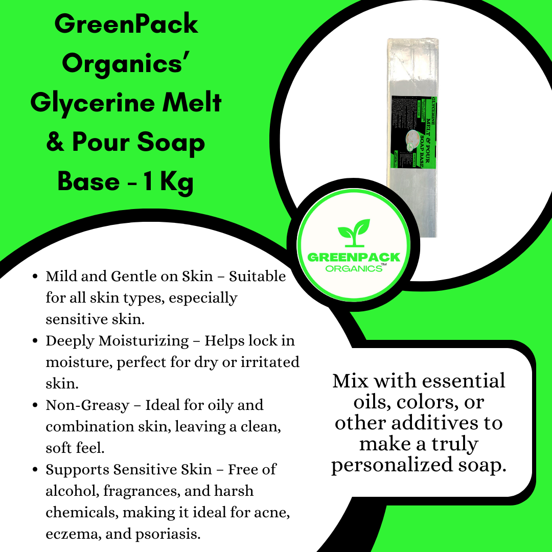 Greenpack Organics Glycerine Melt and Pour Soap Base is the perfect choice for DIY soap makers looking for a high-quality, customizable base. This pure, plant-based glycerine soap base is formulated to be mild on skin, easy to work with, and adaptable for crafting unique soaps with colors, fragrances, or exfoliants of your choice.