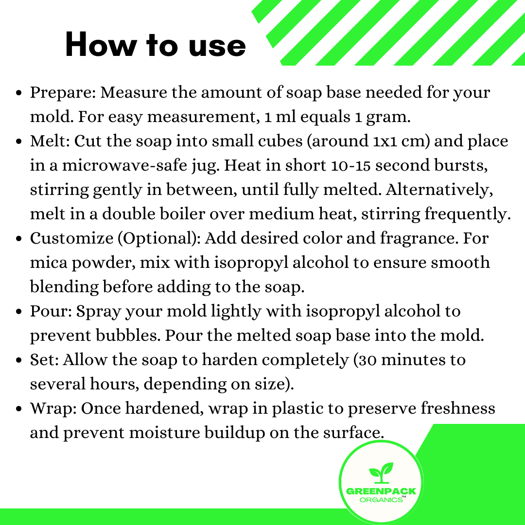 Greenpack Organics Glycerine Melt and Pour Soap Base is a versatile foundation for your soap-making creativity—pure, simple, and packed with benefits for your skin!