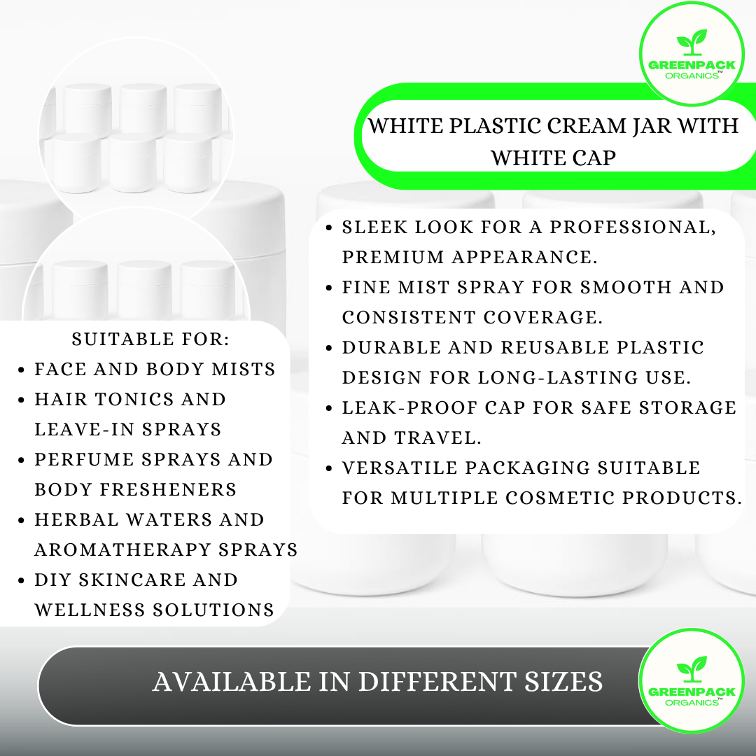 A clean and versatile white plastic cream jar, perfect for cosmetic storage and presentation. Its simple yet professional look makes it suitable for a wide range of skincare and personal care products.